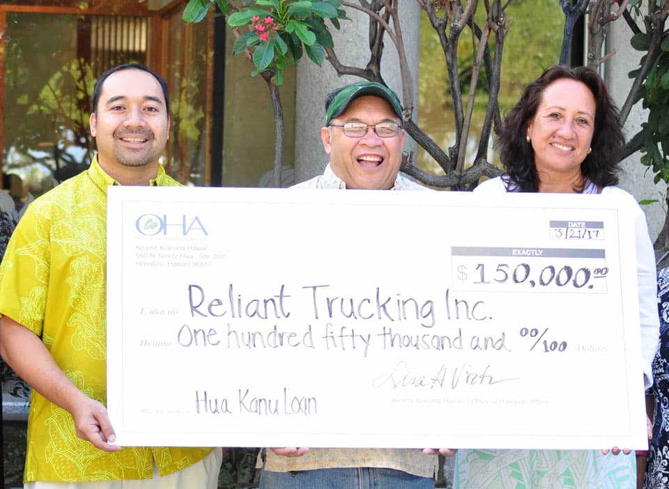 HONOLULU (March 28, 2017) – The Office of Hawaiian Affairs (OHA) last week issued two Hua Kanu business loans, totaling $450,000, to Reliant Trucking Inc. and Goldwings Supply Service Inc, making the two Native Hawaiian-owned businesses the first recipients of OHA’s larger loan product for the year.